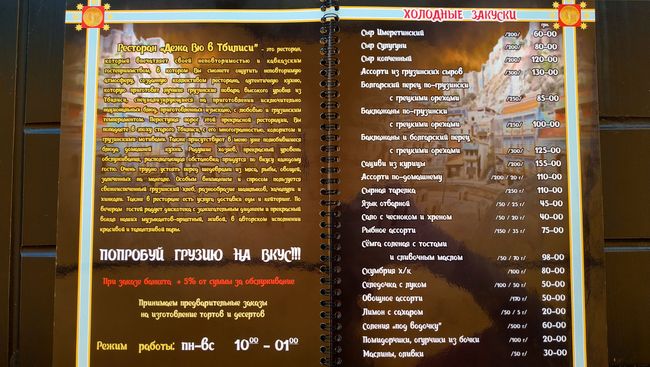 Цены – от 60 грн. за 300 г старинного грузинского супа Татариахни до 175 грн. за 200 г Харчо по-мегрельски (говядина в ореховом соусе).