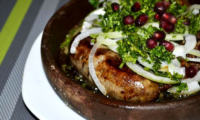 И Купаты и Оджахури по правилам грузинской кухни подаются шкварчащими в специальных керамических сковородках под названием «кеци». К ним – в маленьком соуснике – кисло-сладкий сацебели, приготовленный на основе томатов и зелени, и свежеиспеченный грузинский хлеб.