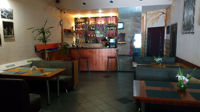 Сразу при входе - бар со столами и диванчиками на 20 персон.