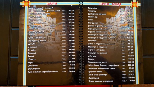 Было обеденное время. Официант принес меню, которое мы начали изучать с огромным желанием отведать что-нибудь вкусное и оригинальное из грузинской кухни. Из меню стало ясно, что здесь готовят украинские и грузинские блюда.