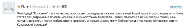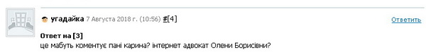 До речі, на коментар «Гості» читач «Угадайка» написав відповідь: «Це мабуть, коментує пані Карина? Інтернет-адвокат Олени Борисівни?» (так звати голову Козелецької ОТГ).