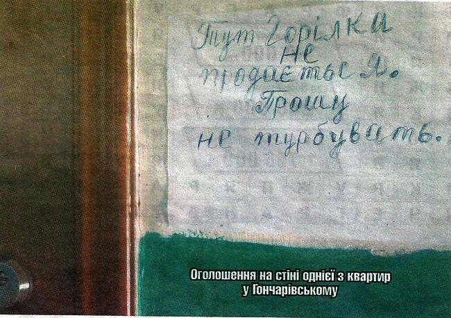 У магазинах, що в Гончарівському, заборона: не можна продавати горілку хлопцям у військовій формі. Деякі мешканці біля своїх квартир порозвішували білі аркуші з написами: «Тут горілка не продається. Прошу не турбувать». Скільки б не говорили про заборону «точок», та люди йдуть. Кажуть: для продавців зеленого змія зараз зірковий час. Цінова політика така: самогонка до 40 гривень за півлітра, розведений спирт — самий ходовий товар, від 25 до 30 за півлітра.