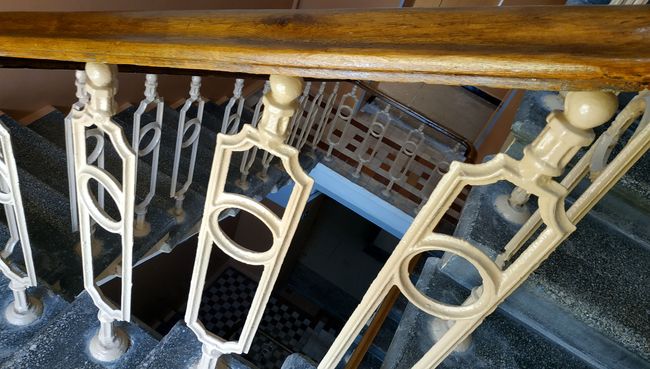 Отполированы и покрыты лаком перила на лестничных пролетах, покрашены металлические балясины.