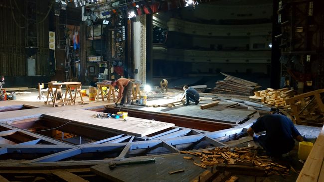 А пока в театре полным ходом проходит капитальный ремонт сцены, обновляются кулуары, фойе и гардеробные. Надо сказать, что сцена не ремонтировалась с самого открытия театра. То есть, планшет сцены, как нам сообщили,не менялся ни разу за 61 год!