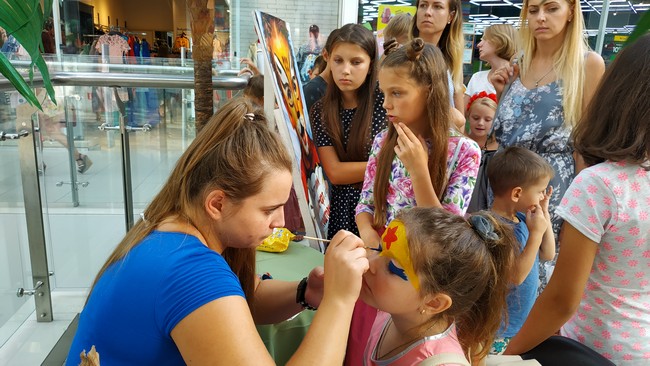 Для детей сегодня целый день бесплатно работали батуты, поезд, игровые автоматы (кроме призовых), а также, аквагрим и блеск-тату.