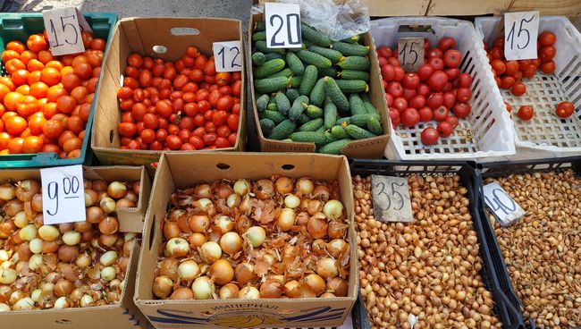 В теплый воскресный день сентября, наш корреспондент побывал в продовольственном павильоне рынка, называемом «Хит рынок» и на территории, специально оборудованной для торговли сельскохозяйственной продукцией. Изменились ли цены с наступлением осени?