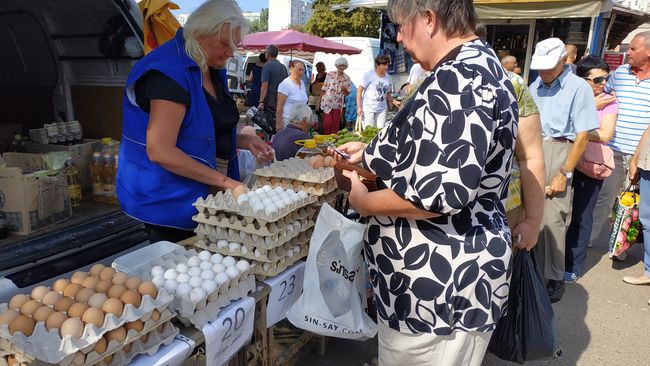 Помимо изобилия осенних фруктов и овощей, на прилавках домашняя молочная и мясная продукция, куриные яйца, мёд, малина и зелень. И все эти дары природы продают по ценам лета, а некоторые позиции, например, небольшие желтые помидорчики – вообще, по смешной цене – 6 гривен за килограмм.