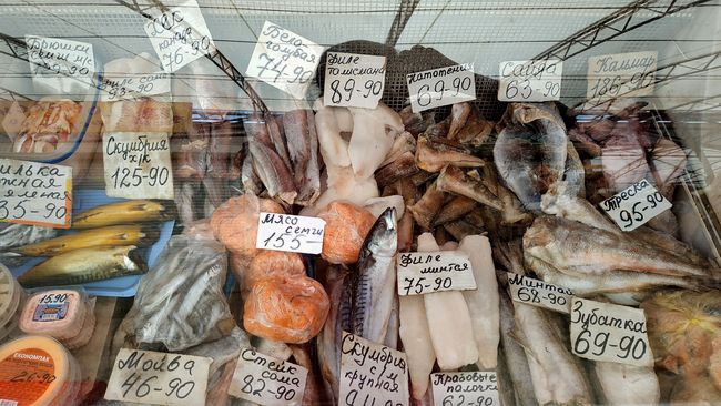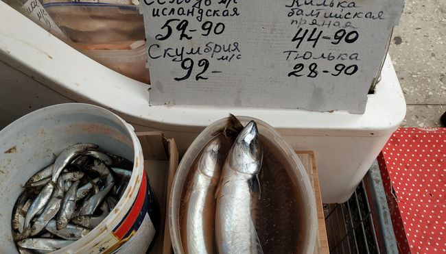 На рынке довольно большой выбор свежемороженой, соленой и копченой рыбы. Цены на рыбу за 1 кг: