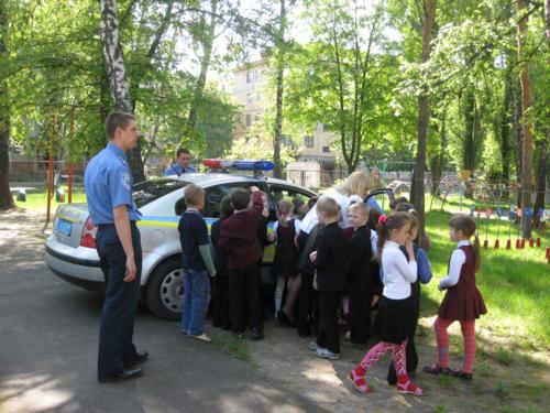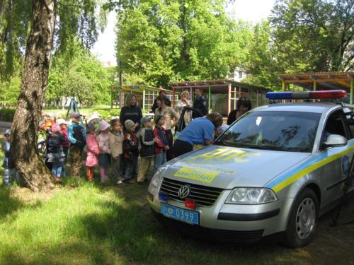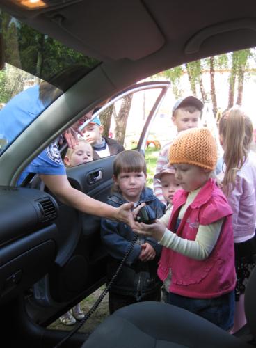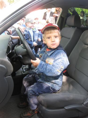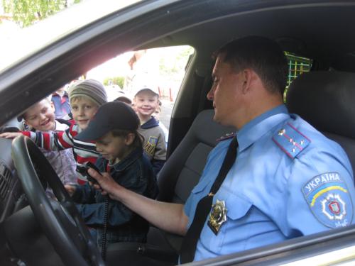 Виявляється, маленька дитина за кермом – це не просто безпечно, а й… корисно. Посидіти за кермом патрульної машини, сказати кілька слів в рацію, увімкнути сирену та посигналити – мали змогу всі вихованці цього дитсадка.Погода була тепла і сонячна. Тому заняття «Основ безпеки на дорозі» проходило не у приміщенні дитсадка, а на зеленій галявині. Дорожні знаки, справжня патрульна машина та інспектори неабияк зацікавили малюків.