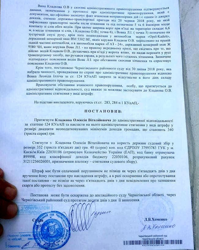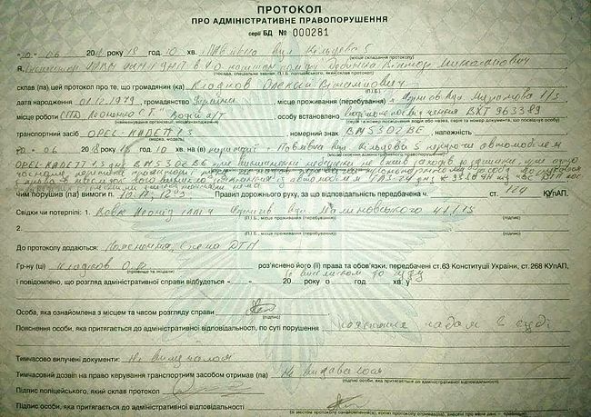 В протоколе указано, что Кладков не принял мер к остановке своего Опеля, чем нарушил требования пунктов 10:17 и 12:3 Правил дорожного движения, за что предусматривается ответственность за повреждение транспортных средств – ст. 124 Кодекса Украины об административных правонарушениях (КУоАП).