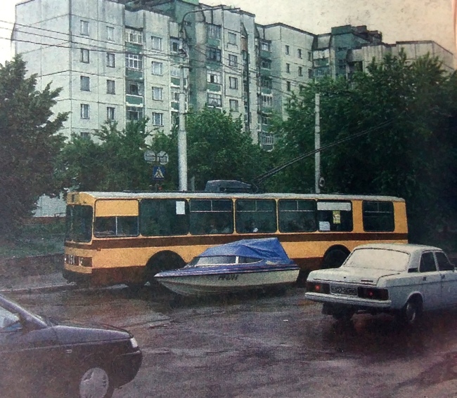 Там у них даже специальная дорожная разметка существует. Автомобилисты не мешают велосипедистам, те, в свою очередь, не распугивают на тротуарах пешеходов. Скукотища, одним словом. То ли дело у нас! Автомобили - хорошо, троллейбусы - хорошо, а моторные лодки на проезжей части города - куда лучше! В свете последних погодных катаклизмов такой способ передвижения по городу вполне может иметь право на существование. Хозяин плавсредства видимо решил устроить то ли регату, то ли ралли на улицах города, хорошо хоть не задавил (или не утопил?) никого. Но троллейбус был подрезан мастерски. Гран-при черниговского этапа Формулы-1 разыгран!