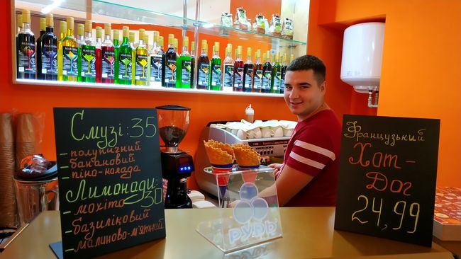 Два указателя-меню на прилавке предлагают гостям на выбор клубничный, банановый и «пина колада» смузи (35 грн.) и лимонады мохито, базиликовый и малиново-мятный (30 грн.). За 25 гривен можно перекусить французским хот-догом, который готовят из длинной булочки, откуда убирают часть мякиша, наполняют горчицей или кетчупом, и вставляют горячую сосиску. В состав молочных сосисок входит куриное и говяжье мясо. Кушать такой хот-дог удобнее, чем американский - с разрезанной пополам булочкой.