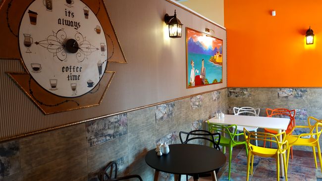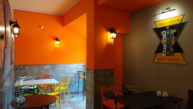 На стенах, в основном выкрашенных в оранжевый цвет, подвешены небольшие светильники. Удачно подобраны оранжевого, желтого и для контраста – салатного и черного цветов – стулья, имеющие оригинальную форму. В итоге, кафе выглядит солнечным и создает хорошее настроение.