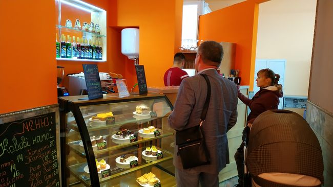 Пока кафешка работает в тестовом режиме, но уже имеет своих посетителей. Кормящая мамочка с малышом заходит выпить латте, так как другого кофе ей пока нельзя. Сотрудники рядом находящихся предприятий заглянули в обеденный перерыв на чашечку эспрессо и гляссе с пирожными.