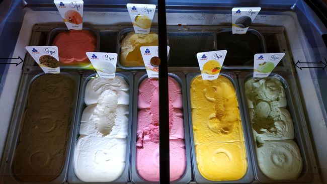 Также, в продаже мягкое мороженое 8 видов (манго, черный шоколад, гранат, блек айс, фисташковое, ванильное и ананасовое) по 9 гривен за шарик (50 г) и 13 - за рожок.