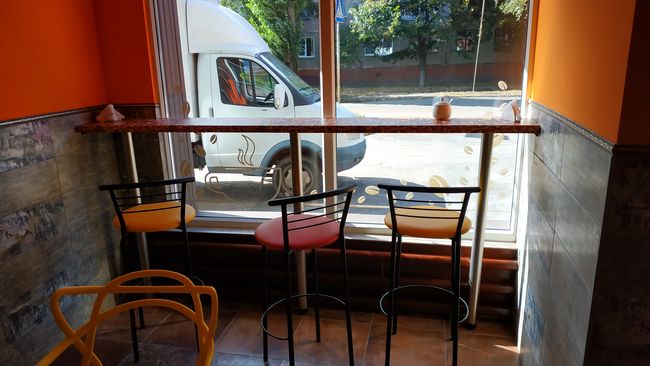 Дальше – столик с яркими разноцветными стульями и стойкой на три места у окна для желающих задержаться на время и поболтать за чашкой горячего напитка.