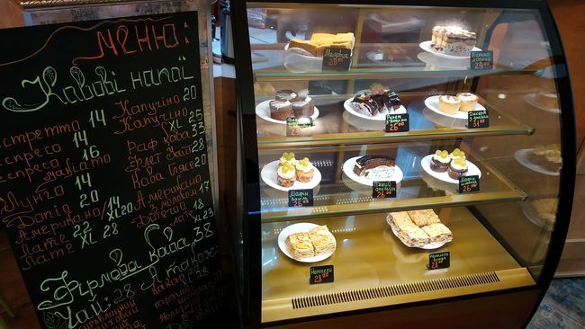 Рядом с прилавком размещена стеклянная витрина с пирожными и доска-меню с указанным ассортиментом чая и кофе. Гостям предложены 13 видов кофейных напитков по цене от 14 (ристретто, эспрессо, лунго) до 33 гривен за раф-кофе, 11 видов чая за 28 гривен (черный – 15), а также, традиционно – горячий шоколад, какао и молочный коктейль.