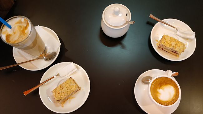 Мы тоже заказали американо с молоком (17), латте (22) и «Наполеон» с вишней (28). Торт оказался немного суховат, не совсем пропитан вишней, а напитки – по-настоящему вкусными.