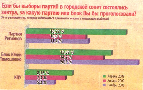 На сегодня лишь семь политических сил имеют шансы попасть в городской совет. Из них — пока только три партии (блока) уверенно преодолевают планку 3-х процентного барьера. На первое место вырвалась Партия регионов. За них готовы отдать голоса 18,22% черниговцев. Безусловно, в сложные экономические времена критика действующих властей всегда пользуется поддержкой населения. Поэтому, городские «регионалы» вовремя проснулись после зимней спячки и, засучив рукава, принялись активно критиковать и протестовать. Симпатии к городскому БЮТ слегка повысились, но до осеннего рейтинга еще не дотягивают. Горожане отдали второе место «бютовцам» с результатом 15,59%. Стоит заметить, что городской БЮТ впервые уступил пальму первенства политических предпочтений черниговцев.