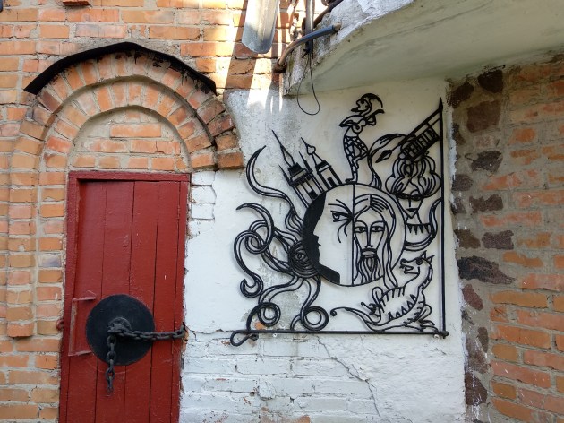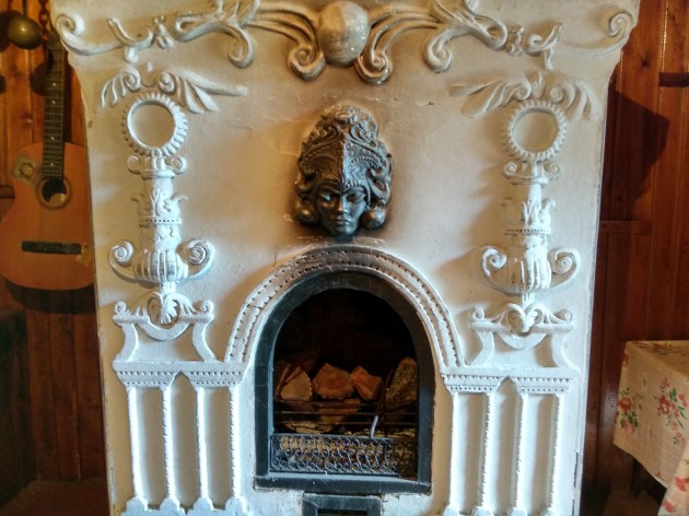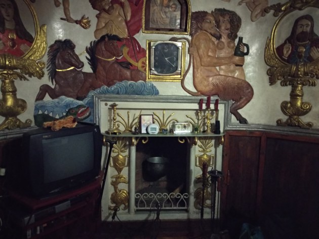Сміючись, заходжу всередину - в кухню-камінний зал. Над каміном — ну, просто якесь "панно радянського атеїзму": і чорти з пляшкою, і ангели, й ікони зі святими, всі в золоті, поруч, і всі "дружать". Бог Солдатову, впевнена, все простив, бо він був людиною своєї епохи.