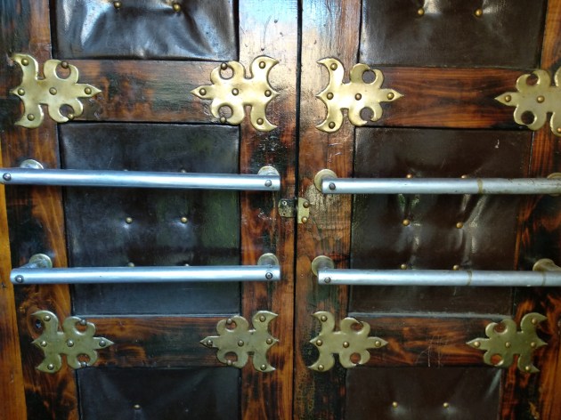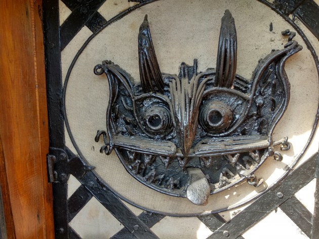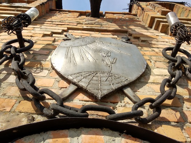 Господиня пропонує мені відчинити вхідні двері замку. Вони мають дві стулки з довгими ручками і прикрашені металевим візерунками. Сіпаю ті ручки, та, як і у вежі, двері мені не піддаються. Посміхаючись, господиня каже "Сім-сім, відкрийся!" і вони-таки відчиняються. Цей процес супроводжується різким звуком сирени, так що я аж підскакую від несподіванки. Водночас звертаю увагу, що насправді двері - суцільні, а дві стулки - то як "кишеня-обманка". Оглядаючи периметр дверей, здогадуюсь, що відкрилися вони натиском замаскованої у стіні педалі. Чудеса, та й годі!