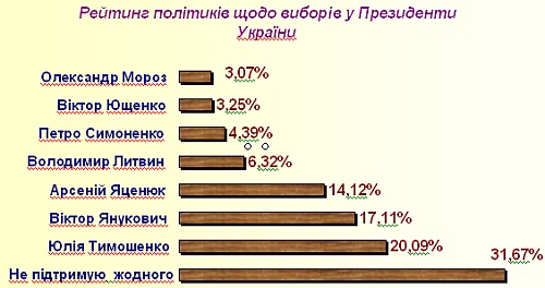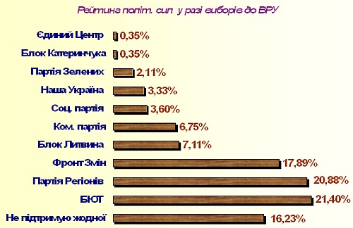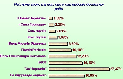 За даними Центру найвищу підтримку чернігівців до Верховної ради можуть отримати БЮТ (21 %), Партія Регіонів (20 %) та Фронт Змін (17 %). Якби вибори відбулися сьогодні, Блок Литвина набрав би 7 %, КПУ — 6 %, соцпартія та “Наша Україна” по 3 %. І все б здавалося добре, але дивно тільки те, що рейтинги політичних сил є вищими за рейтинги їхніх лідерів, - а це, як показує практика, — є неприпустимим, адже до цього завжди рейтинги лідерів на декілька відсотків перевищували рейтинги очолюваними ними політичних сил.