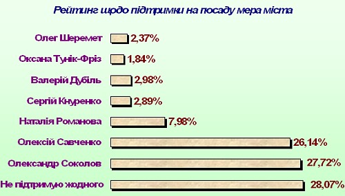 За словами Олени Левошич, в травні чернігівці хочуть бачити мером міста Олександра Соколова (27 % голосів опитаних), чи зміниться ситуація наступного місяця дізнаємось...наступного місяця, - директор Центру муніципальних досліджень обіцяла проводити постійний моніторинг соціально-політичної ситуації в місті. Відомий банкір і колишній очільник чернігівської “Десни”, що являється безпосереднім опонентом діючого міського голови, Олександр Савченко відстає від Соколова всього на один відсоток (26 %). На думку Олени Левошин, “Савченко підняв свій рейтинг завдяки активній піар-кампанії, що супроводжувалась організацією “суботника”, роздачею пайків для малозабезпечених та ветеранів.