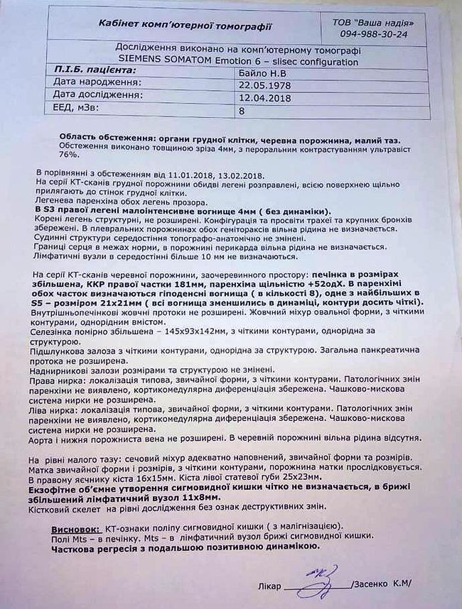 Наталія через півроку розповіла, що пройшла 6 курсів хіміотерапії ФОЛФОКС 6, а також 10 курсів таргетної терапії препаратом Ербітукс, який входить до складу першої лінії терапії онкології європейських протоколів та отримала доволі гарні результати.