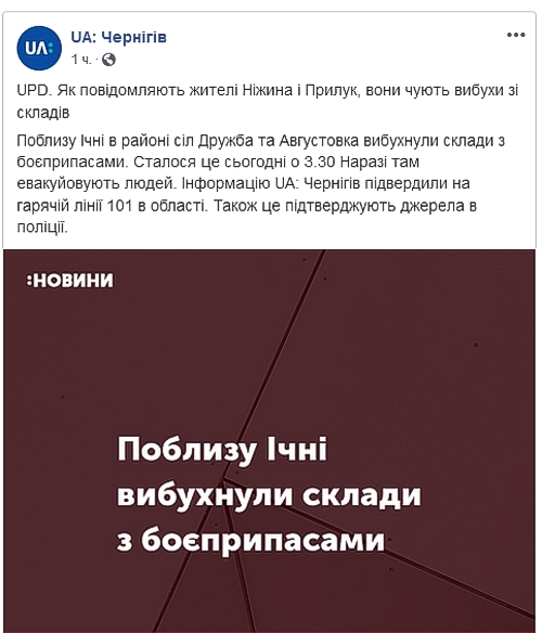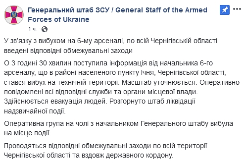 О 3 годині 30 хвилин поступила інформація від начальника 6-го арсеналу, що в районі населеного пункту Ічня, Чернігівської області, стався вибух на технічній території. Масштаб уточнюється. Оперативно повідомлені всі відповідні служби та органи місцевої влади. Здійснюється евакуація людей. Розгорнуто штаб ліквідації надзвичайної події.