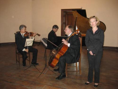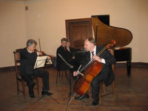 Всего лишь на один час Рыцарский зал дворца в заповеднике «Качановка», как в старые добрые времена, превратился в прекрасный концертный зал, в котором со своей новой концертной программой выступило знаменитое трио в составе народного артиста Украины, профессора Национальной музыкальной академии, лауреата Государственной премии им. Т. Г. Шевченко Анатолия Баженова (скрипка), заслуженного артиста Украины, доцента Национальной музыкальной академии Ивана Кучера (виолончель) и заслуженного артиста Украины, доцента Национальной музыкальной академии Юрия Кота (фортепиано).