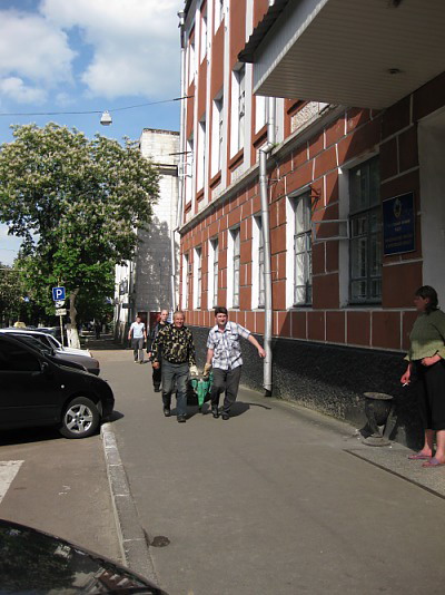 Развивая эксперимент, мы решили таким же образом пройтись с люком мимо милиционеров. Может, хоть они поинтересуются, откуда у нас «водоканаловское» добро. Для начала мы протащили люк на тележке мимо Деснянского райотдела. БОльшая часть люка была прикрыта, но всё равно прекрасно было видно, что у нас за груз, да и круглая форма угадывалась ясно и чётко! Такая «маскировка», согласно здравому смыслу, должна была бы насторожить стражей порядка.