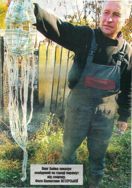 — Куди тепер людині вертатися? — хитає головою 50-річний Олег Бойко. — Було, город їм орав. Зайшов подивитися. Ось, знайшов парашут від снаряда, — показує білу штуку з номером. — У деяких