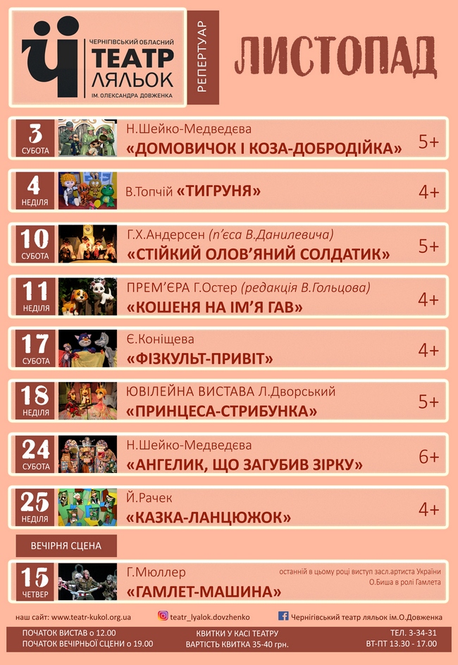 Репертуар Черниговского областного театра кукол имени Довженко на ноябрь 2018 года: