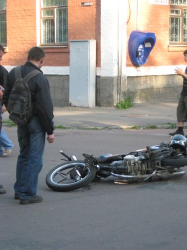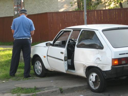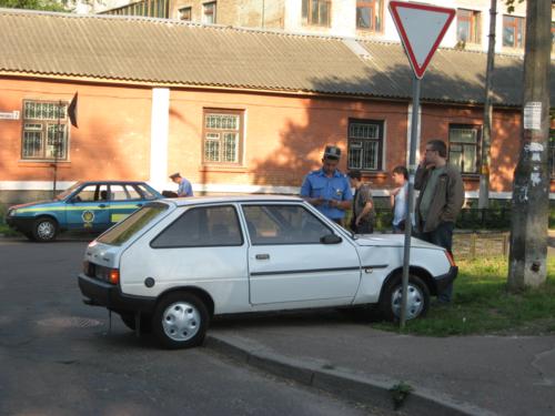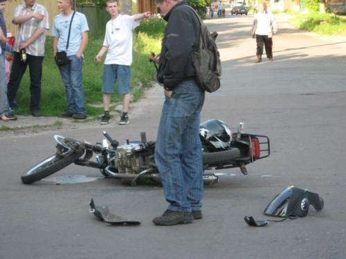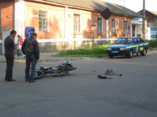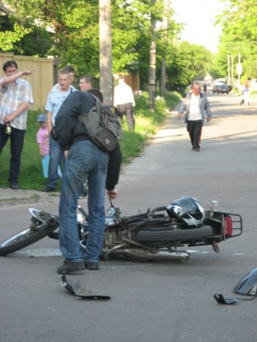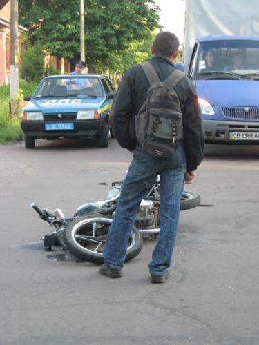 Дякувати Богу, зіткнення відбулося на малій швидкості, тому ніхто не постраждав, лише мотоцикліст,підкульгуючи на ногу, роздивляється те, що залишилось від його “японця”. Ситуацію з'ясовують працівники державтоінспекції.