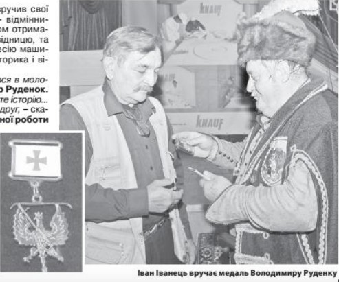 А потім голова клубу «Колекцюнер» Валентин Іванець, який у таких випадках виступає в образі чернігівського козацького полковника Мартина Небаби, вручив Володимирові Руденку медаль «За віру і відданість Чернгову та клубу «Колекцюнер» гад номером п'ять. За популяризацію іс-торіі Чернігова, випущені 10 брошур з цієї тематики і за велику пропагандистську роботу: численні екскурсії, лекції.