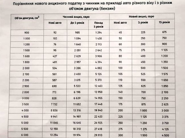Закон полностью меняет модель акцизного налога, вводятся базовые ставки акциза. Для новых легковых автомобилей с бензиновым двигателем до 3000 куб. см базовая ставка составит 50 евро, для более кубатурных – 100 евро. Для дизельных авто до 3500 куб см ставка составит 75 евро, для более кубатурных - 150 евро.