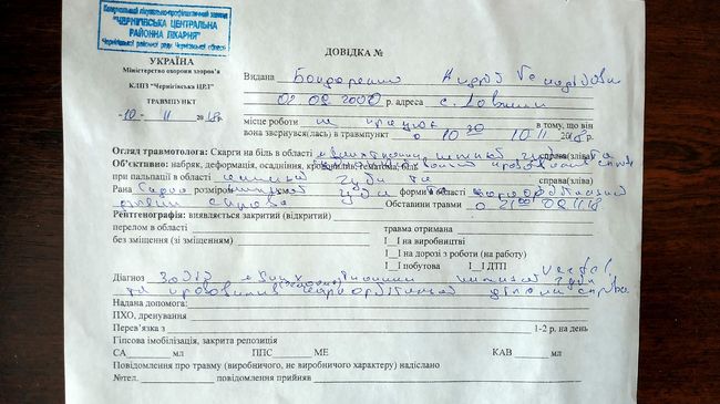 Андрей переночевал со мной в Чернигове, и утром мы обратились в районную больницу за помощью. Его осмотрели в приемном отделении 3 или 4 врача, и дежурный врач выписал справку, в которой указал диагноз «забій м’яких тканин з множинними гематомами».