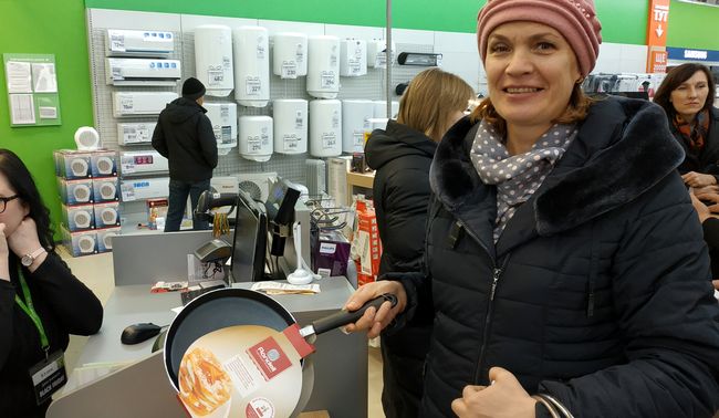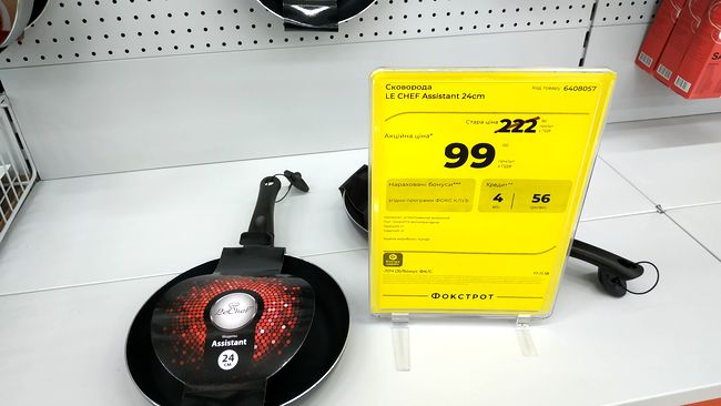 Большим спросом у хозяюшек пользовалась сегодня сковорода Le Shef Assistant всего за 99 гривен (старая цена 222 гривны, т.е. скидка 55%). Именно, ее мы и приобрели, пользуясь случаем.