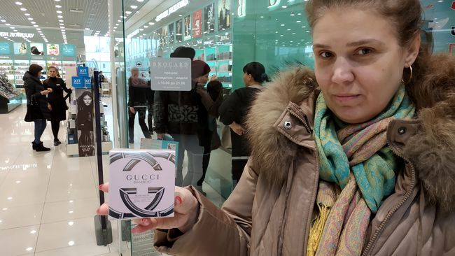 Первым на нашем пути встретилась Светлана, получившая в подарок от мужа духи с ее любимым ароматом от GUCСI со скидкой 30% в фирменном парфюмерном магазине. Первоначальная цена около 2700 гривен.