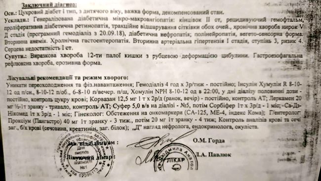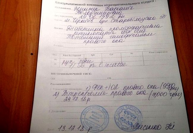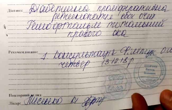 Сделав обследование, врачи Василий Шевчик и Екатерина Лысенко установили предварительный диагноз: «Диабетическая пролиферативная ретинопатия обоих глаз. Гемофтальм тотальный правого глаза», и рекомендовали прийти на консультацию к офтальмохирургу, врачу высшей категории из Киева Филипчуку Александру Николаевичу 13 декабря к 10:00. Врачи подтвердили, что зрение правого глаза можно вернуть. Надо отметить, что подобный осмотр в клинике стоит 500 гривен. Но Олег был приятно удивлен и благодарен, что врачи денег не взяли.