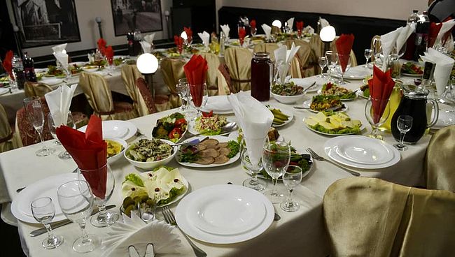 Мінімальне замовлення на 1 людину 550 грн. ( 350 грн. - меню, 50 грн. - алкоголь, 150 грн. – розважальна програма). Можна вносити будь-які корективи, відповідно до побажань гостей.