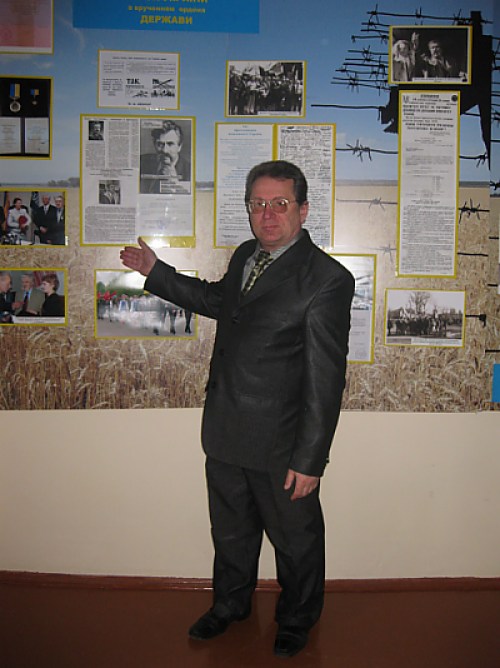 Василь Михалькевич біля стенду, присвяченому видатним землякам