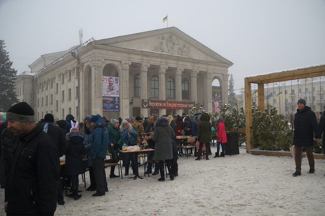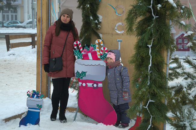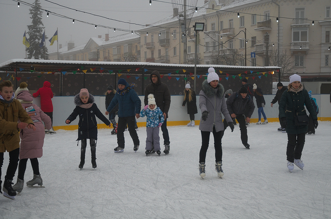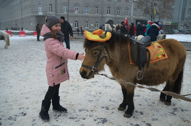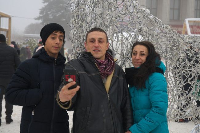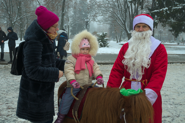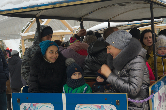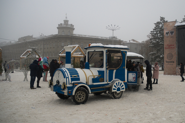 Первый день Нового года в Чернигове выдался туманным, но по-прежнему теплым для зимы. Ближе к полудню, снова жители города вместе со своими семьями, друзьями и знакомыми массово отправились на главную Красную площадь города. Здесь праздник продолжается. Для любителей активного отдыха к услугам ледяной каток, у главной елки и в специальных фотозонах массовое скопление желающих сделать праздничное фото, и конечно же, главное внимание детям. Для них курсирует вокруг елки праздничный паровозик, работают аттракционы, снежная горка и катают их празднично наряженные, но немного грустные пони.