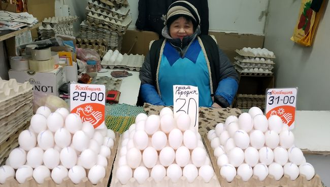 Цены на куриные яйца из Косовщины и Городни здесь на 5, а то и 10 гривен ниже, чем на Центральном рынке в конце года. Тогда самая высокая цена была 39 гривен за десяток. На Хитрынке продают от 29 до 31 гривен за десяток. На домашние куриные яйца цена тоже на 10 гривен ниже, чем на Центральном, то есть – 45 гривен за десяток. Яйца перепелиные в продаже по 15 грн. за десяток, 32 грн. за 20 штук.