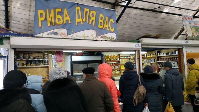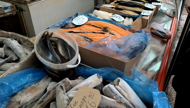 В рыбных павильончиках горожане могут выбрать по своему вкусу свежемороженую, соленую и копченую рыбу. А в одном из них даже выстроилась очередь.
