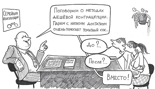 Бесплатные методы контрацепции к добру не приводят. Чем выше интеллект – тем ниже поцелуи! Учитесь зарабатывать деньги, господа, повышайте свою платежеспособность. Тогда и такая житейская необходимость, как качественная контрацепция, станет обычным житейским пустячком, позволяющим вам сосредоточиться на своих приятных мыслях и незабываемых ощущениях, а не на том, как не залететь или что-нибудь не подцепить. Только вот в чем загвоздка: не так-то просто в нашем провинциальном городе получить эту самую достойную зарплату, соответствующую вашему светлому уму!