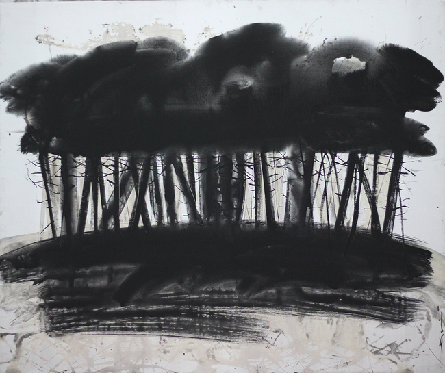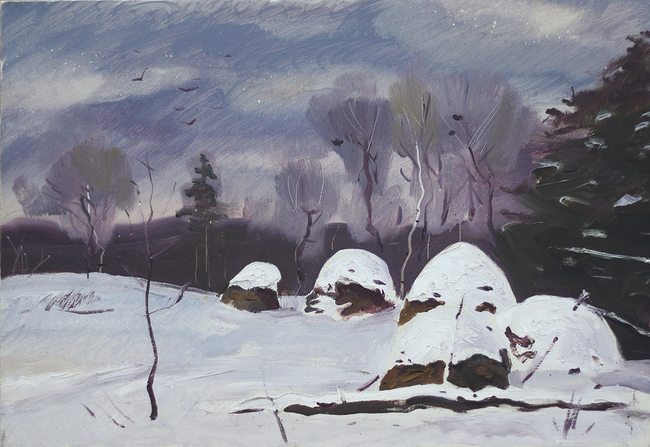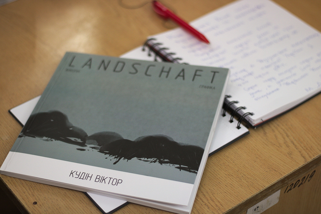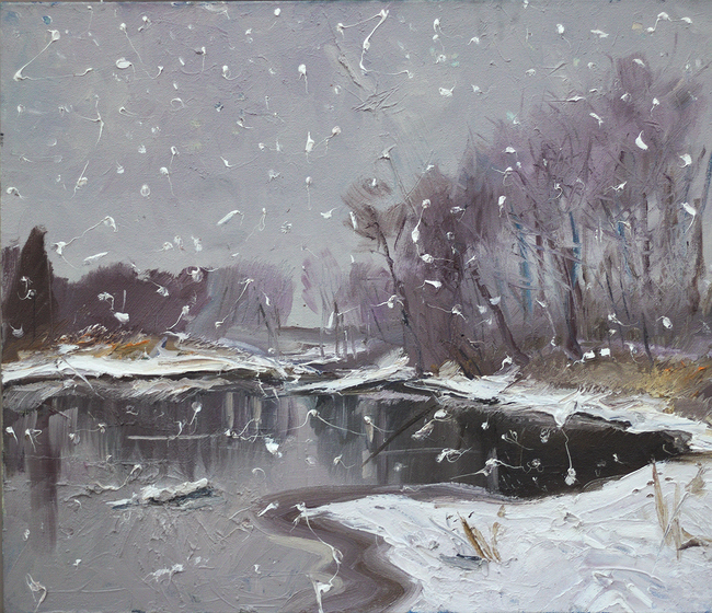 – Чому зима і чернігівські пейзажі? Тому що моя дача знаходиться тут у Чернігівській губернії, і буваючи тут зимою у вихідні дні я брав етюдник і виходив на пленери. Мені цікаво було малювати зимою, тому що немає зелені, страшної для мене, а все воно монохромне, трошки сіреньке, навіть трошки сумне. Малювати доводилось зимою, коли холодно, і тут у мене з’явились такі експерименти, як малювання тушшю, – розказує Віктор Кудін.