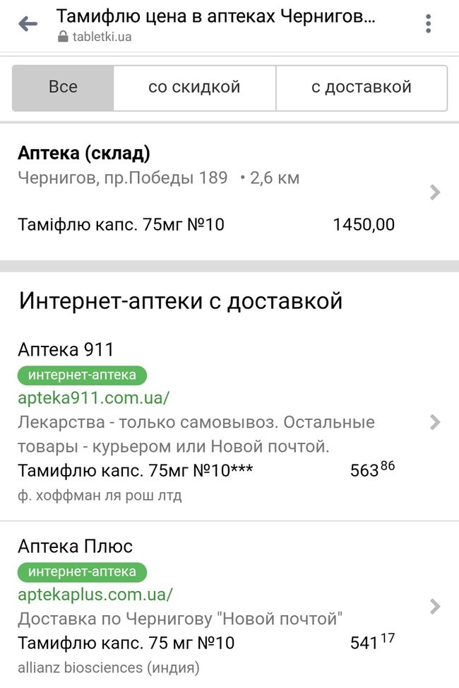 Надо сказать, что перед тем, как посетить аптеки, мы решили узнать о наличии Тамифлю в Чернигове с помощью Интернета. И обнаружили, что Тамифлю в капсулах 75 мг №10 по цене 563.86 и 541.17 грн. предлагают Интернет-аптеки. Есть ли в наличии выяснять мы не стали, но позвонили в аптеку (склад), которая находится по адресу просп. Победы, 189. Здесь нас уверили, что к 19:00 они ожидают доставку данного препарата. Но дело не в наличии, а в цене: 1450 гривен за идентичную упаковку. Оказывается, предприимчивые дельцы быстро смекнули, что можно сделать бизнес и на эпидемии.