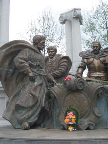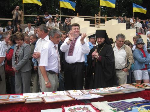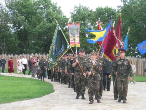 После литии представители органов областной и районной власти, почетные гости, лидеры политических партий и общественных организаций возложили цветы к памятному знаку в виде Креста, который расположен здесь же, в Цитадели, а потом и к новой скульптурной композиции "Гетьманська слава". Этот памятник тоже открылся совсем недавно. В сопровождении военного оркестра колонна участников праздника торжественно прошла к благоустроенному и обновленному Кочубеевскому парку.