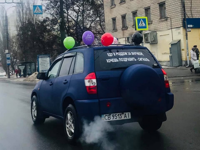 Внедорожник синего цвета на Проспекте Победы зафиксировала сегодня черниговчанка Ольга Кунтыш. Машина была украшена воздушными шариками, а на заднем стекле автомобиля красовалась надпись "Еду в роддом за внучкой, хочешь поздравить - сигналь".